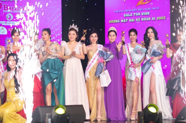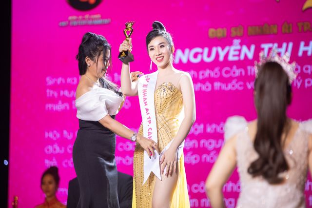Trong đêm Gala, người đẹp sinh ra tại Bến Tre và lập nghiệp tại Cần Thơ này vinh dự được Hoa hậu nhân ái năm 2019 Thu Thảo và Á hậu Vương Thu Dung trao kỷ niệm chương chứng nhận danh vị mới.