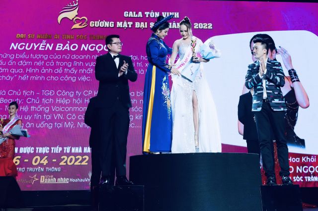 Ca sĩ Dương Ngọc Thái (phải), Đại sứ hình ảnh Bích Ngọc và Ngài Maxle trao danh vị Hoa hậu nhân ái cho Hoa khôi Nguyễn Bảo Ngọc