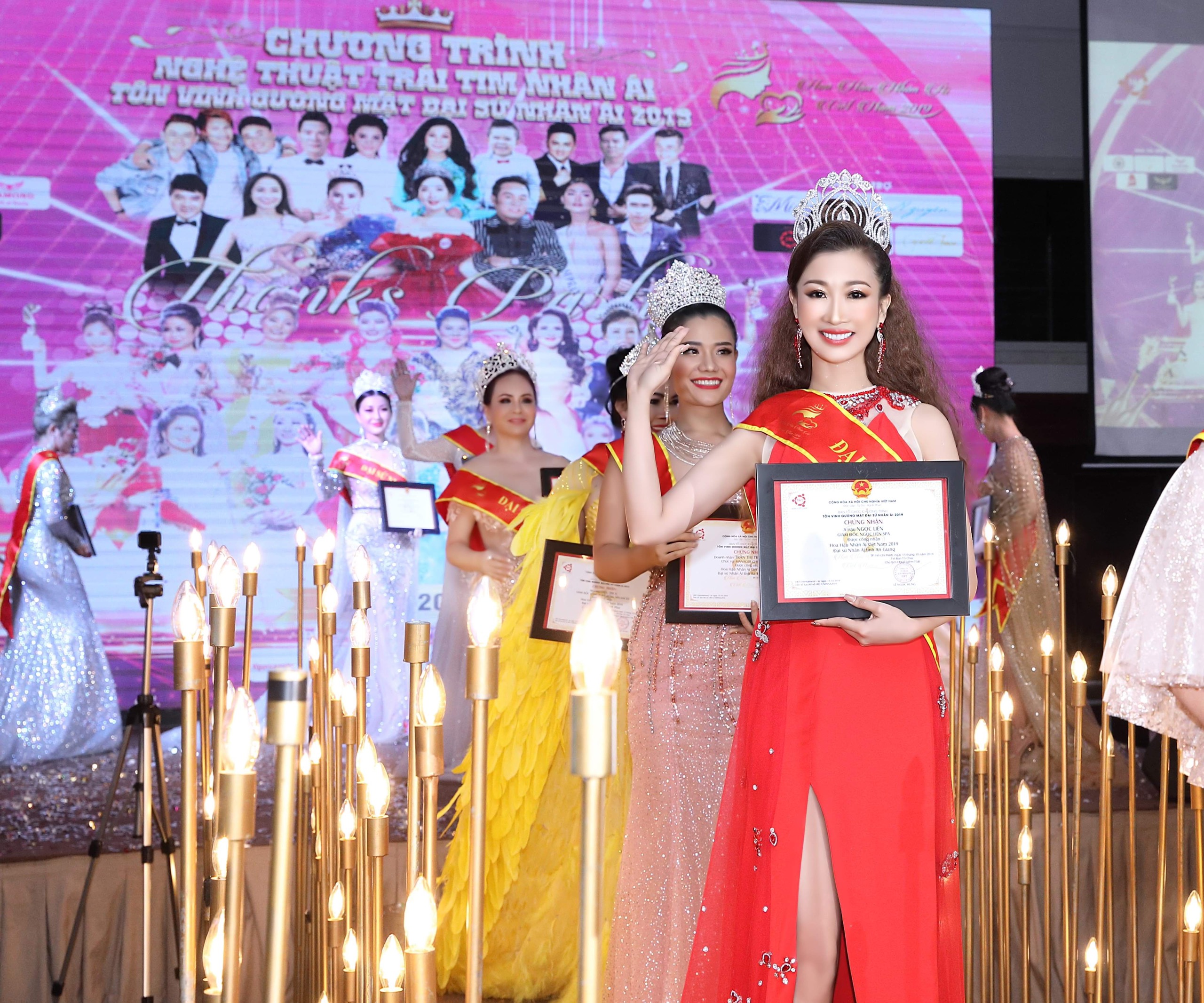 Được bình chọn và tôn vinh cho ngôi vị Đại sứ Nhân Ái tỉnh An Giang – dự án thuộc bản quyền của HKT Entertainment, Ngọc Liên chia sẻ: “Hơn ai hết, mình thấu hiểu nổi vất vả, khó khăn của nhiều đồng bào quê hương An Giang. Trên cương vị là Đại sứ nhân ái, mình nguyện sẽ truyền đi bức thông điệp yêu thương, kêu gọi các tổ chức, cá nhân đóng góp sức mình để trẻ em nghèo có thêm cặp sách đến trường, người già neo đơn có nơi nương tựa, người bần hàn có thêm mái ấm. Công việc sắp tới sẽ khó khăn nhưng bằng cả trái tim, mình tin sẽ hoàn thành trọng trách này”.