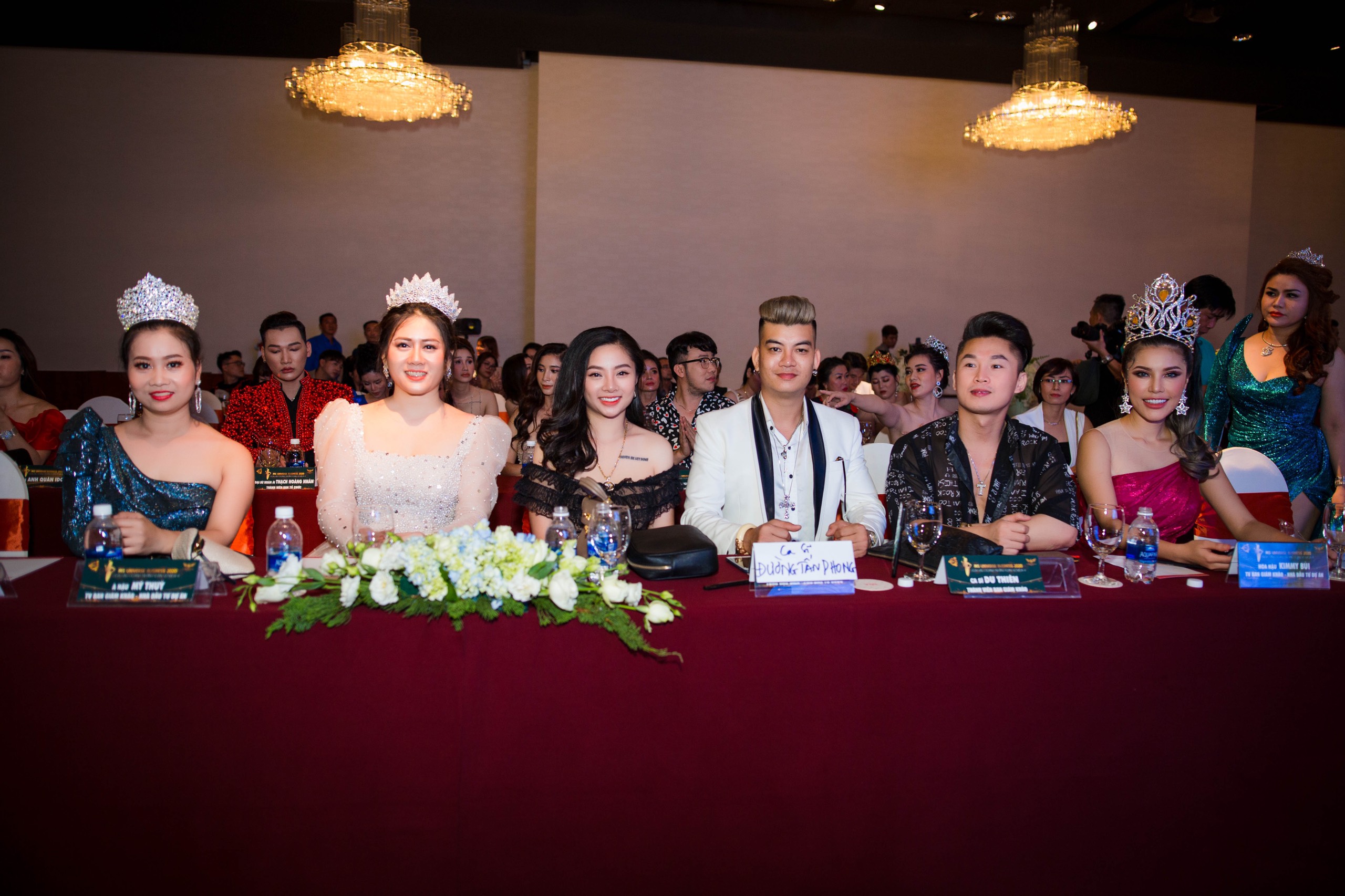 Từ phải qua: Hoa hậu Kimmy Bùi, Ca sỹ Du Thiên, Vợ chồng ca sỹ Đường Tấn Phong – Tú Oanh, Á hậu Vũ Mỹ Thùy, Hoa hậu Lina Hoàng tại buổi họp báo