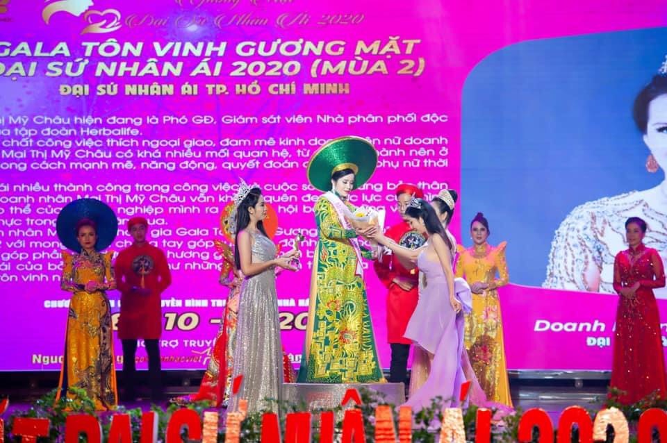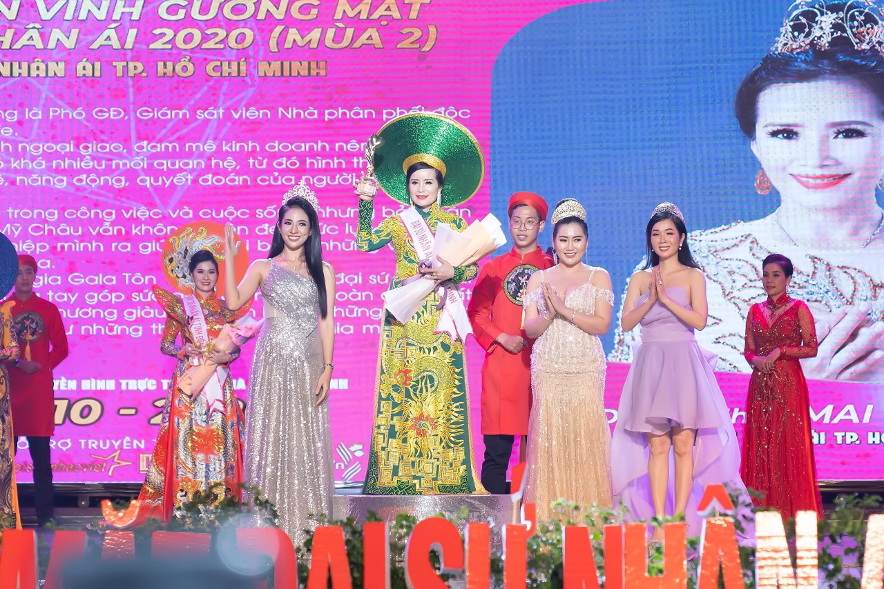 Đến từ TP.HCM, nữ doanh nhân Mai Mỹ Châu cũng được vinh danh và trở thành Hoa hậu Đại sứ nhân ái ở thành phố phát triển bật nhất cả nước. “Đây là khoảnh khắc tuyệt vời nhưng tôi nghĩ đến trách nhiệm hành động hơn là tận hưởng niềm vui. Bằng những gì có thể, tôi sẽ thực hiện sứ mệnh của mình thông qua những hành động cụ thể và thiết thực nhất nhằm góp sức để xã hội ngày một tốt đẹp hơn” – Hoa hậu nhân ái Mai Mỹ Châu chia sẻ.