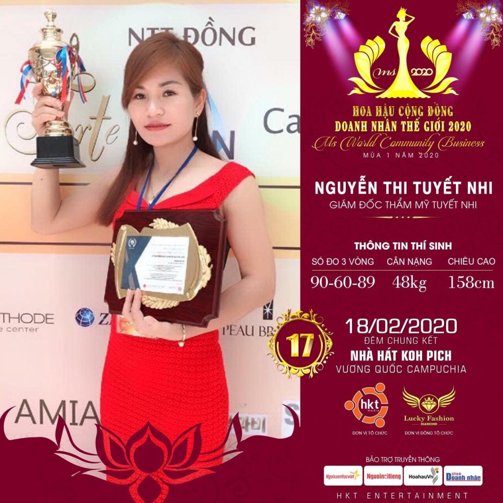 Hoa hậu Cộng đồng Doanh nhân Thế giới 2020 – Ms Communyty World Business đã bắt đầu hé lộ dàn thí sinh xinh đẹp và tài năng. Đây là cuộc thi quy tụ những ứng viện hội tụ đủ 5 yếu tố quan trọng: sắc – tâm – tài – tầm – nhân để giới thiệu hình ảnh nữ doanh nhân Việt đa tài đến với bạn bè khắp nơi. Nguyễn Thị Tuyết Nhi – GĐ Thẩm mỹ Tuyết Nhi đến từ Đài Loan là kiểu mẫu ứng viên như thế.