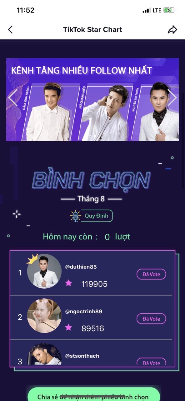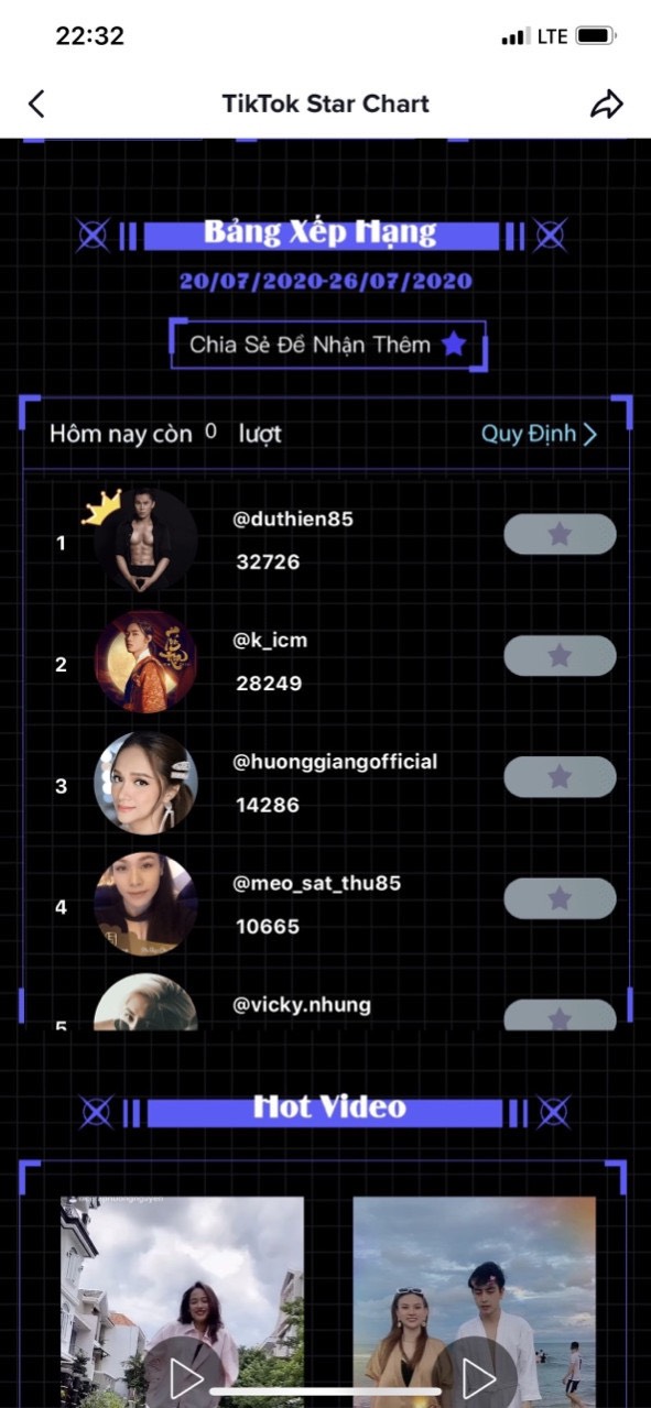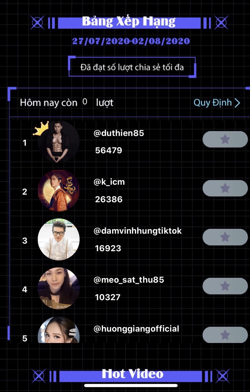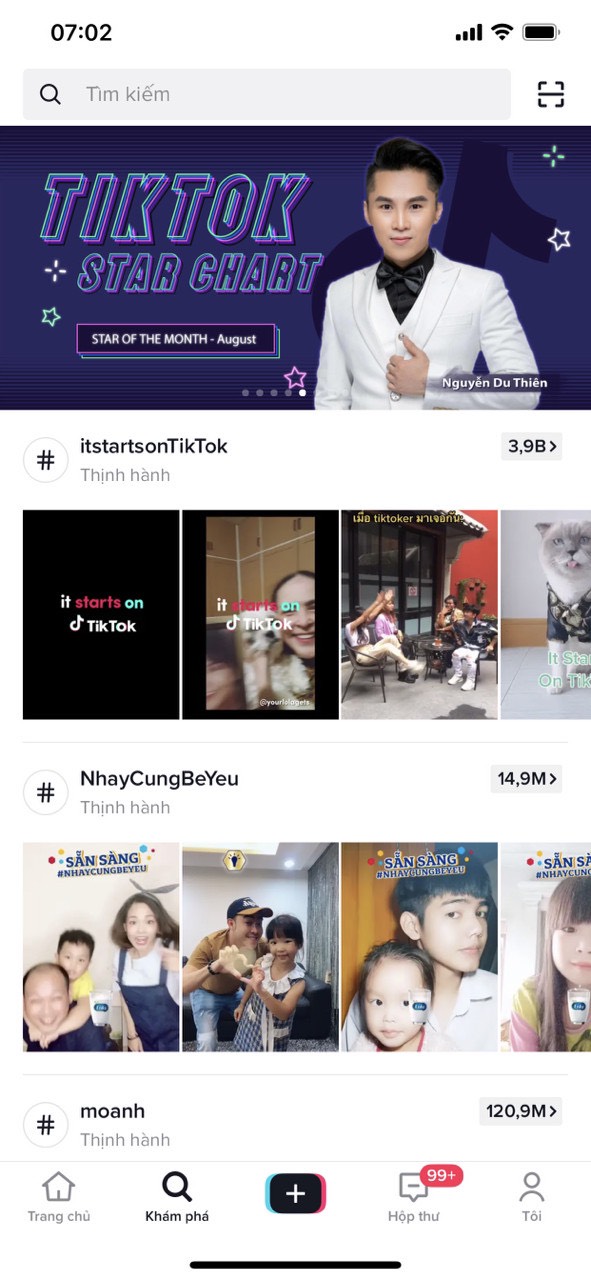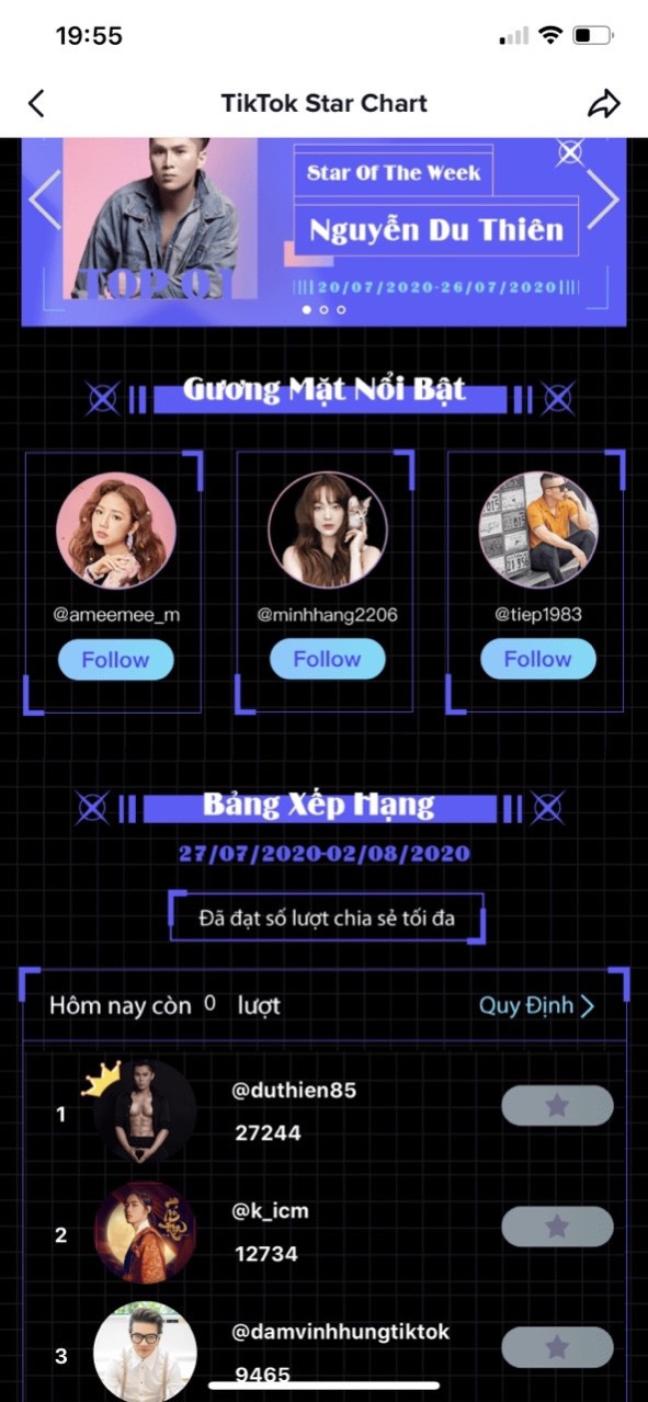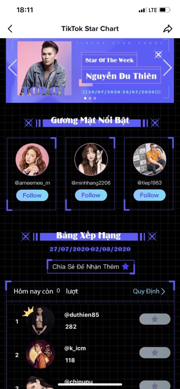 Mới đây, anh tiếp tục cán đích ở vị trí quán quân trên bảng xếp hạng Tiktok Star Chart tháng 10. Đây không phải lần đầu tiên anh đạt được thành tích này. Trước đó vào tháng 8, Du Thiên cũng xuất sắc đánh bại nhiều hot Tiktoker khác để liên tục đứng top 1 BXH. Điều này khẳng định sự đa tài của chàng ca sĩ gốc Hải Dương này trong lĩnh vực nghệ thuật, khi vừa có thể biểu diễn, sáng tác và diễn xuất.