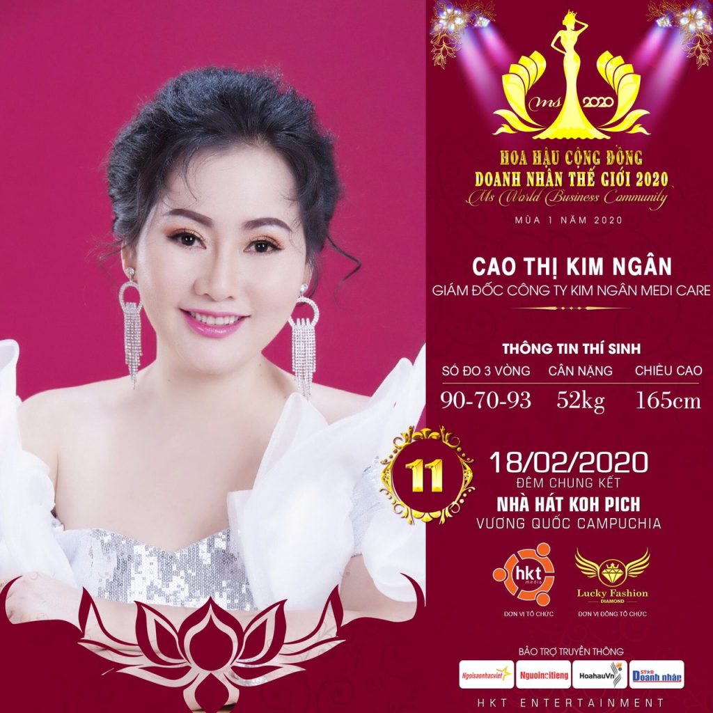 Toàn bộ vòng chung kết cuộc thi sẽ diễn ra tại Vương quốc Campuchia vào đầu tháng 2/2020 và thí sinh đăng quang sẽ nhận được vương miện, tặng phẩm trị giá hơn 2 tỷ đồng. Hy vọng đây là hành trình đẹp để thí sinh mang SBD 11 Cao Thị Kim Ngân sẽ tỏa sáng theo cách riêng của mình.