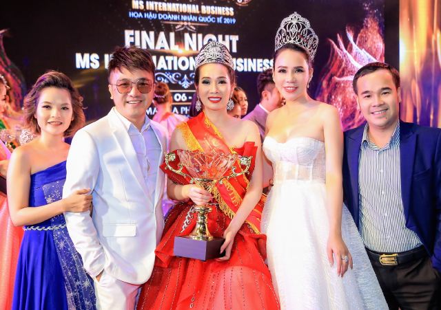 Hoa hậu Doanh nhân Quốc tế 2018 Lê Đỗ Minh Thảo (thứ hai từ phải qua) và ca sĩ Dương Ngọc Thái (thứ hai từ trái qua) chúc mừng Vivian Trần trong ngày đăng quang năm 2019
