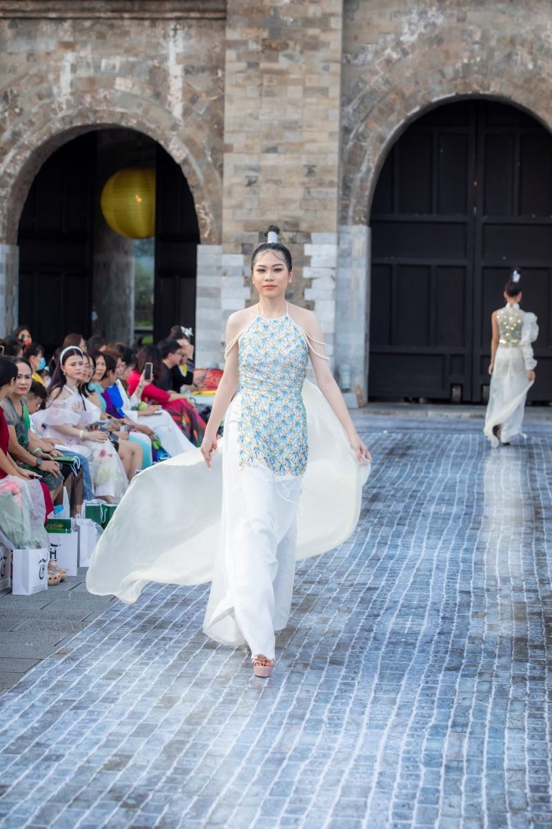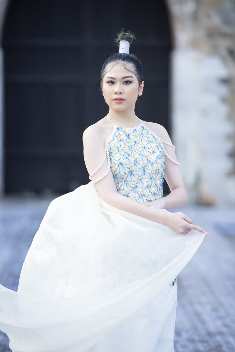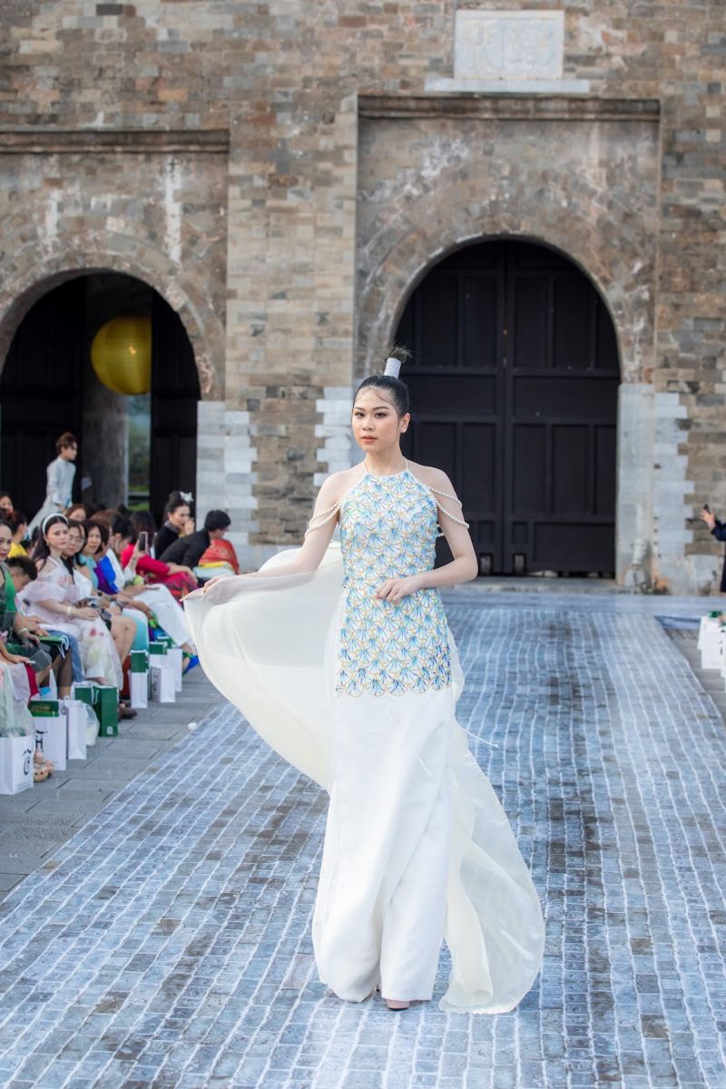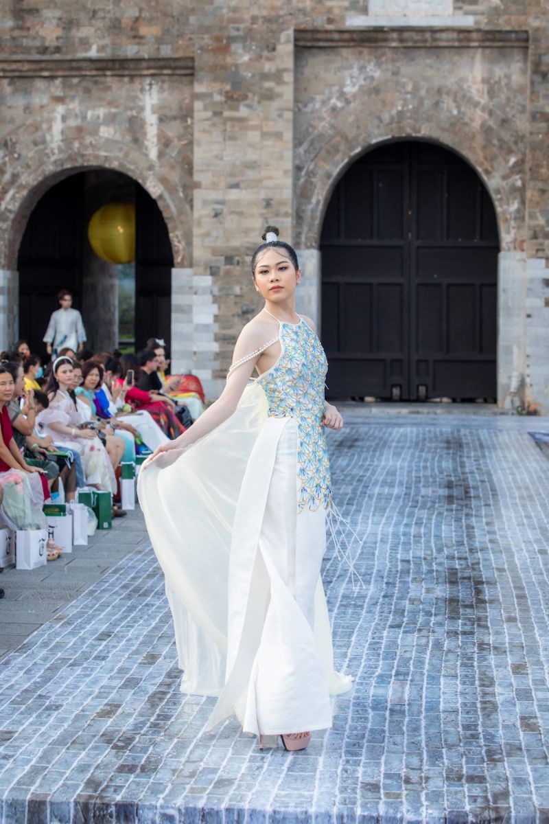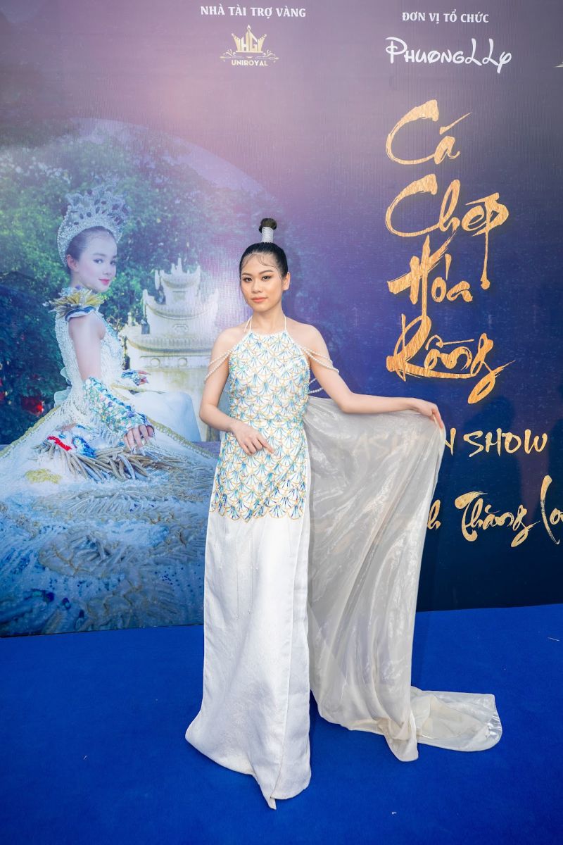 Theo chia sẻ của NTK Phương Hồ, chị phát triển các mẫu áo có màu sắc chủ đạo là trắng và xanh biển. Các thiết kế ứng dụng những đường xẻ cách tân. Hình ảnh cá chép sử dụng kỹ thuật thêu tay, tạo hình từ vảy kim sa lấp lánh, thể hiện ý nghĩa vượt vũ môn qua những ngọn sóng lớn