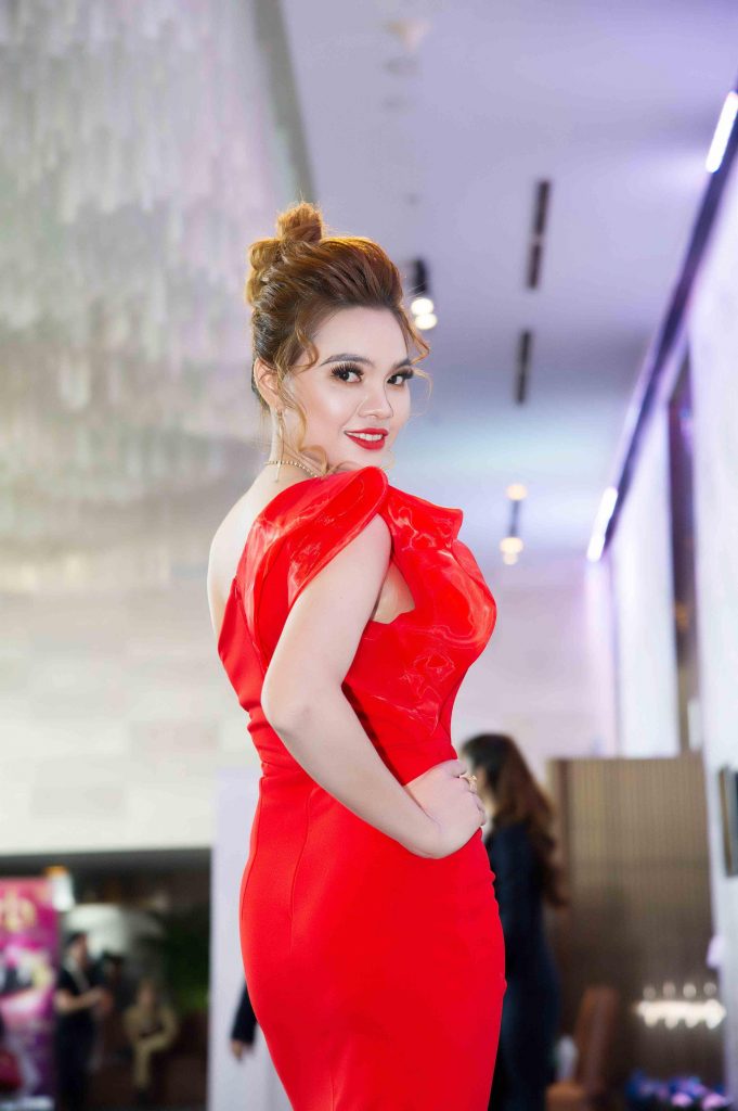 Trong bộ váy đỏ rực xẻ cao và quyến rũ, Hoa hậu có hình thể đẹp Ms Good Shape 2019 Nguyễn Tuyết hội ngộ cùng dàn sao đến tham dự và chúc mừng buổi họp báo thành công của cuộc thi Hoa hậu Cộng đồng Doanh nhân Thế giới 2020.