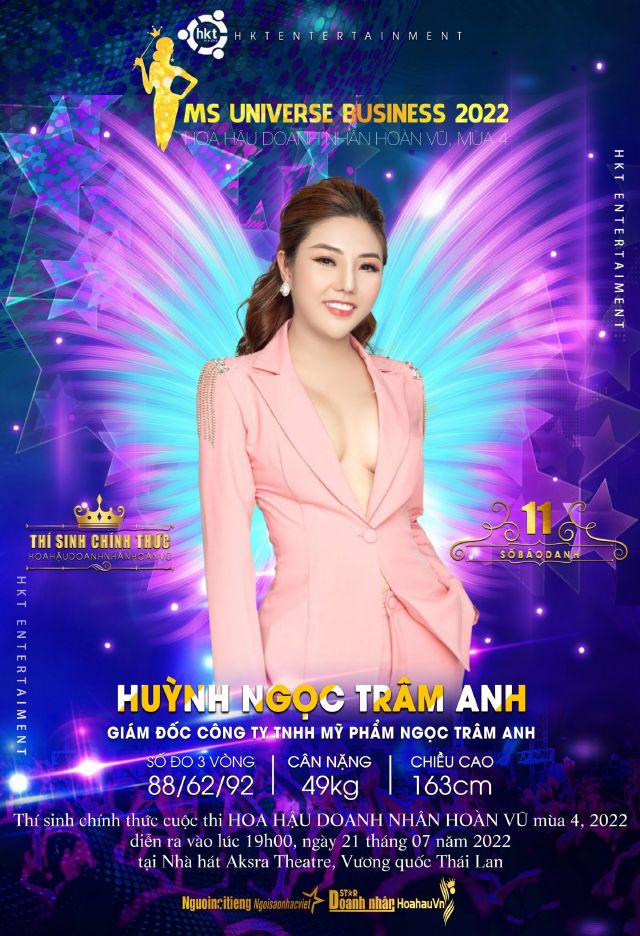 Hoa hậu Doanh nhân Hoàn vũ là cuộc thi quy tụ đông đảo dàn nghệ sĩ danh tiếng của showbiz Việt cũng như các ngôi sao Thái Lan đồng hành và tham dự. Đây là dự án độc quyền và tổ chức thực hiện bởi công ty giải trí HKT Entertainment. Mới đây nhất, nữ doanh nhân có cái tên rất đẹp Huỳnh Ngọc Trâm Anh đã vượt qua vòng sơ tuyển và trở thành thí sinh chính thức để tranh tài tại cuộc thi năm nay.
