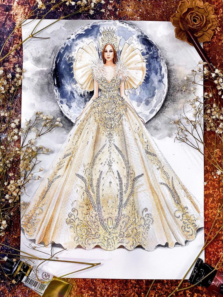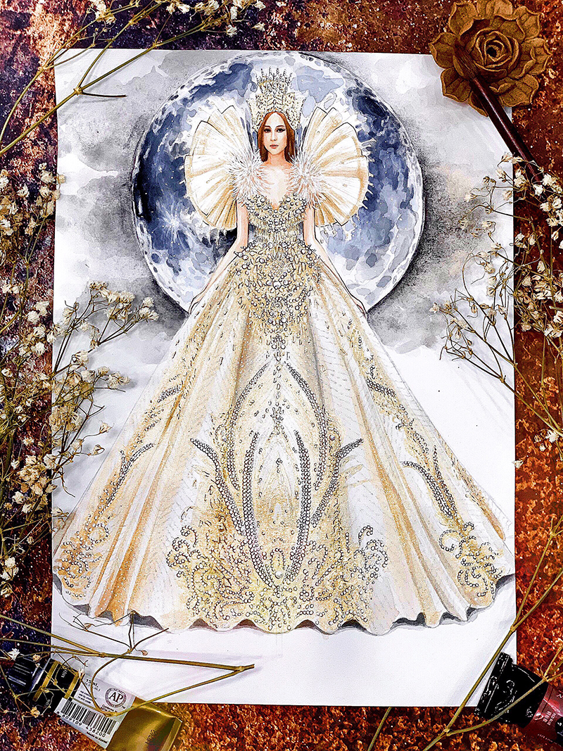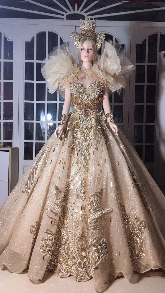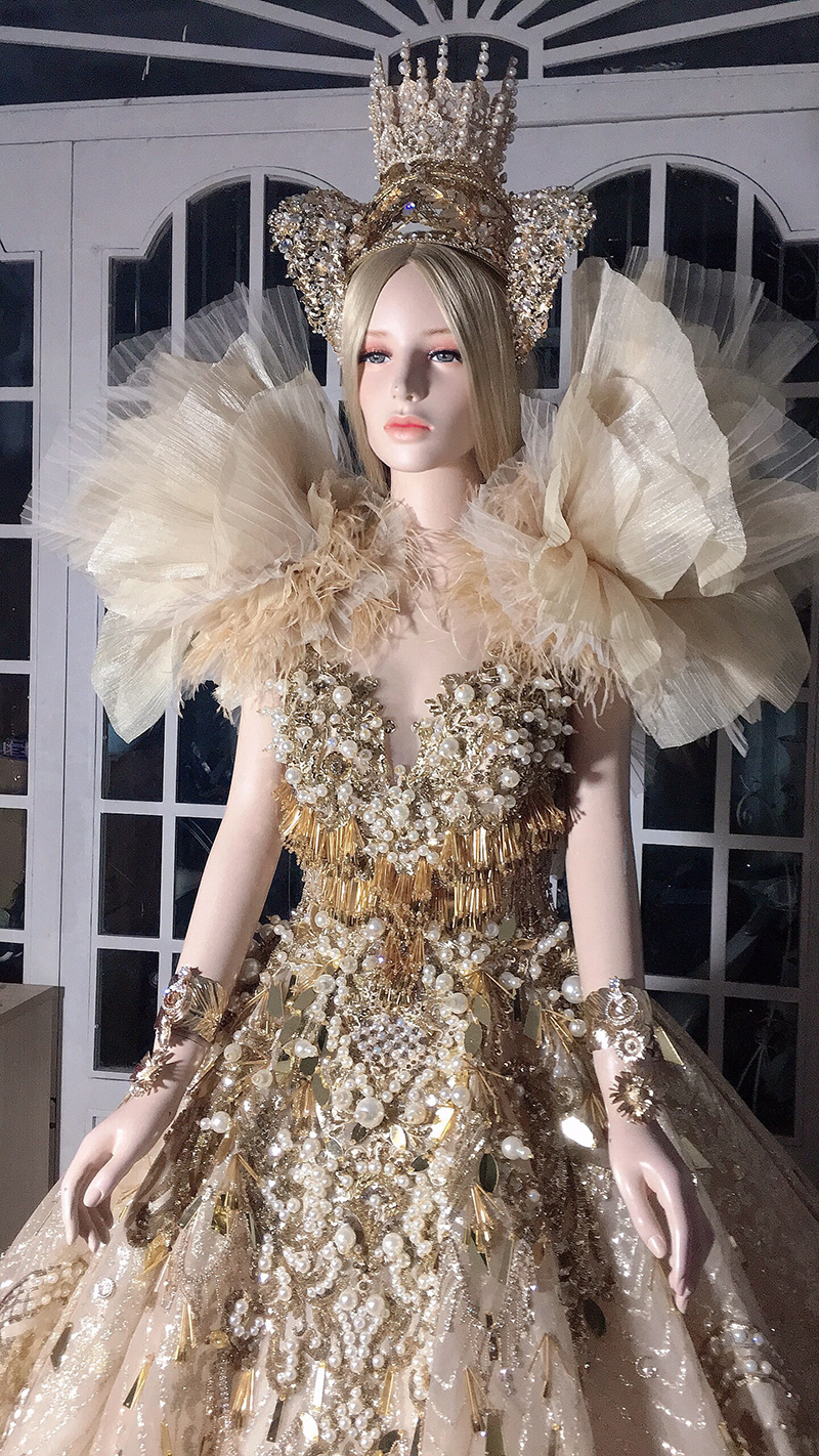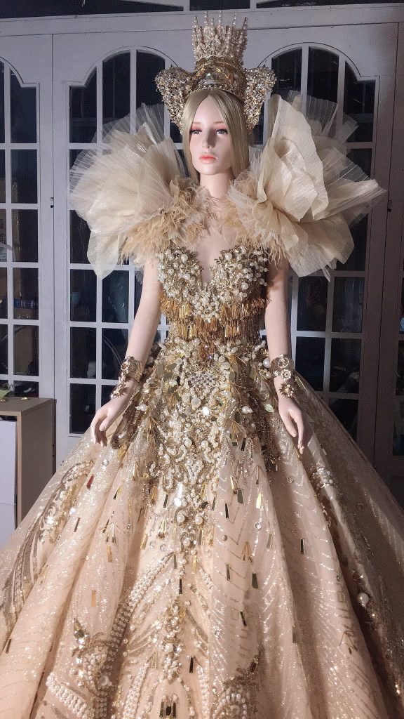 Trước ngày lên đường, ban tổ chức đã nhận được chiếc đầm dạ hội tuyệt đẹp mang phong cách hoàng gia sang trọng với tên gọi Royal Style. Đây cũng là vật phẩm của cặp đôi nhà thiết kế tài năng Micae Vũ – Hương Vũ, đồng sáng lập thương hiệu HuTu Fashion dành tặng riêng cho chương trình để đấu giá gây quỹ từ thiện.