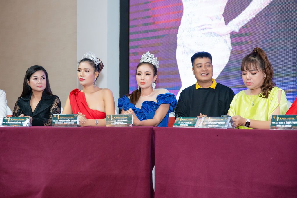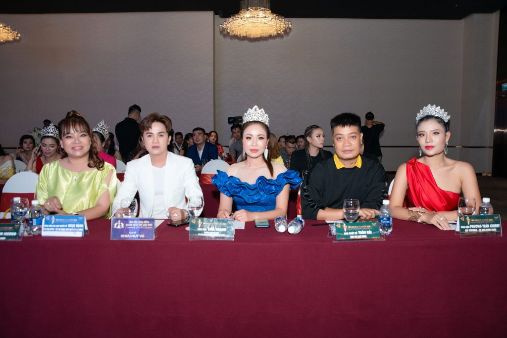 Từ phải qua: Á hậu Phương Trần Cherry, NTK Tuấn Hải, Hoa hậu Lina Hoàng, Ca sỹ Khưu Huy Vũ, Á khôi Hồ Thanh Hương