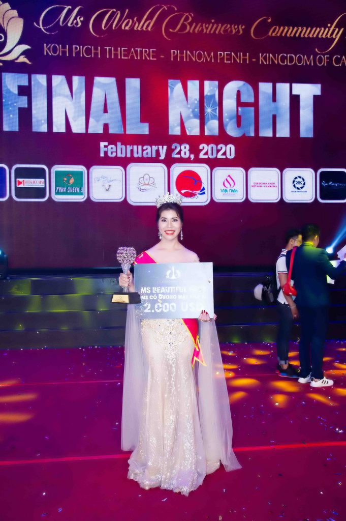 Với vẻ đẹp tự nhiên, phong cách sang trọng với lối giao tiếp gần gũi, thông minh, vượt qua nhiều ứng viên sáng giá khác, người đẹp đến từ thành phố Hải Dương – SBD 07 đã giành được danh hiệu Hoa hậu có gương mặt khả ái nhất – Ms Beautyful Face từ cuộc thi Hoa hậu Cộng đồng Doanh nhân Thế giới – Ms World Community Business 2020 mùa đầu tiên vừa mới kết thúc tại thủ đô Phnom Penh, vương quốc Cambodia.